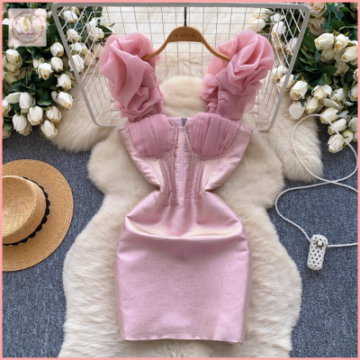 HB6197 Women's Dress New summer three-dimensional mesh flower dress design heavy waist banquet pink dress long skirt Womenswear