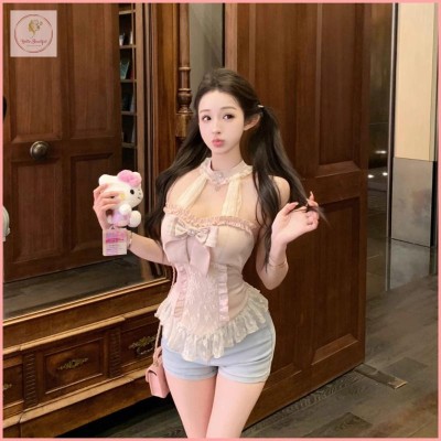 HB6306 Women's Pink bow suspender halter vest for summer with lace stitching, and top