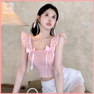 HB5774 Women's Summer sweet bow girl pink plaid lotus leaf sleeve vest one shoulder short elastic fit top