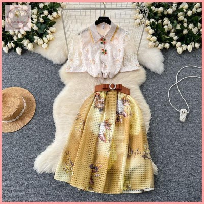 HB5913 Women's coord New style suit, all-match polo collar lace shirt + design waist printed skirt