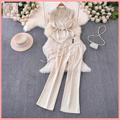 HB5995 Women's sleeveless suit collar loose coat two-piece suit high waist straight wide-leg pants