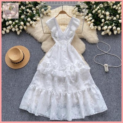 HB5953 Women's white dress fairy V-neck double-layer ruffle waist jacquard mesh long skirt
