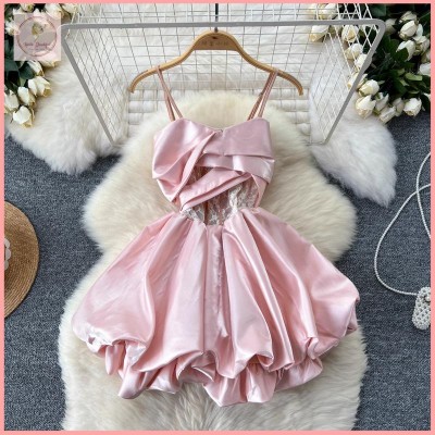 HB6184 Women's Birthday party dress, high-end lace patchwork waist flower bud puffy suspender dress