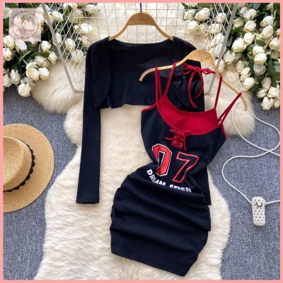 HB6042 Women's suit early autumn outfit halter neck strap letter print dress long sleeve shawl